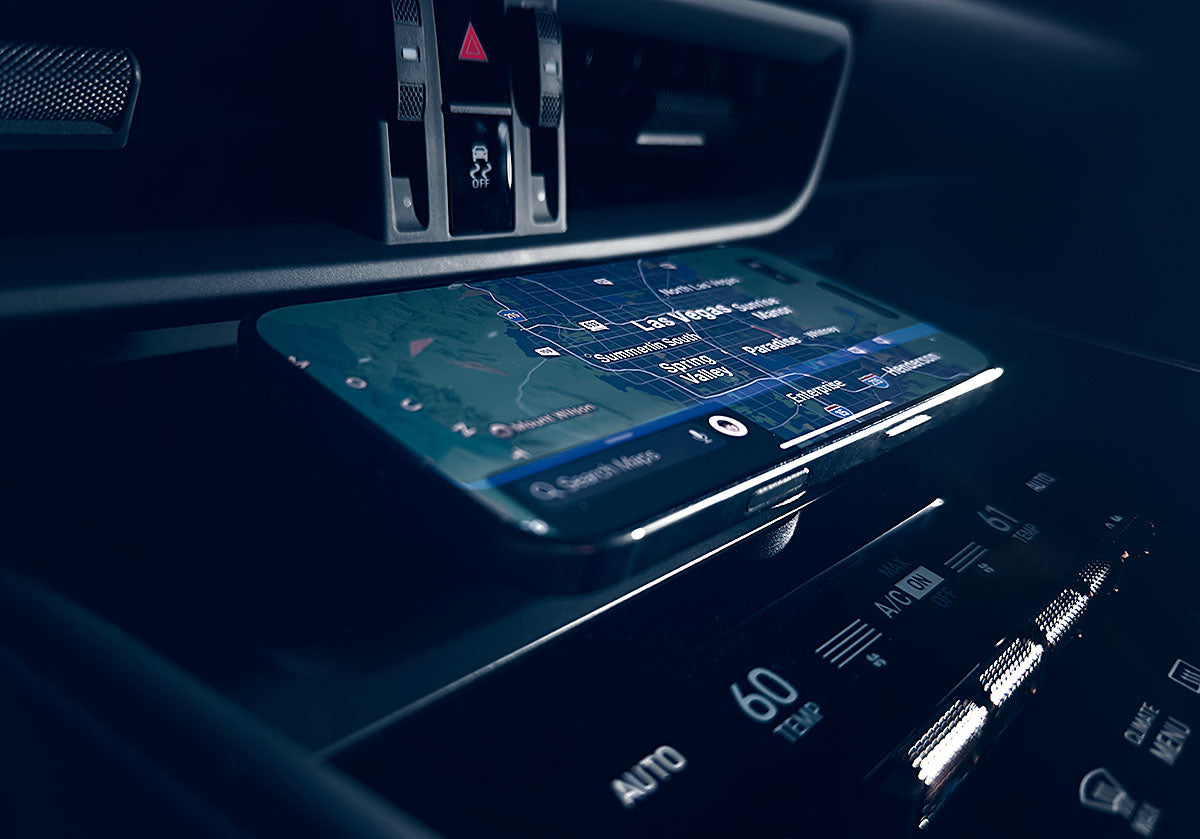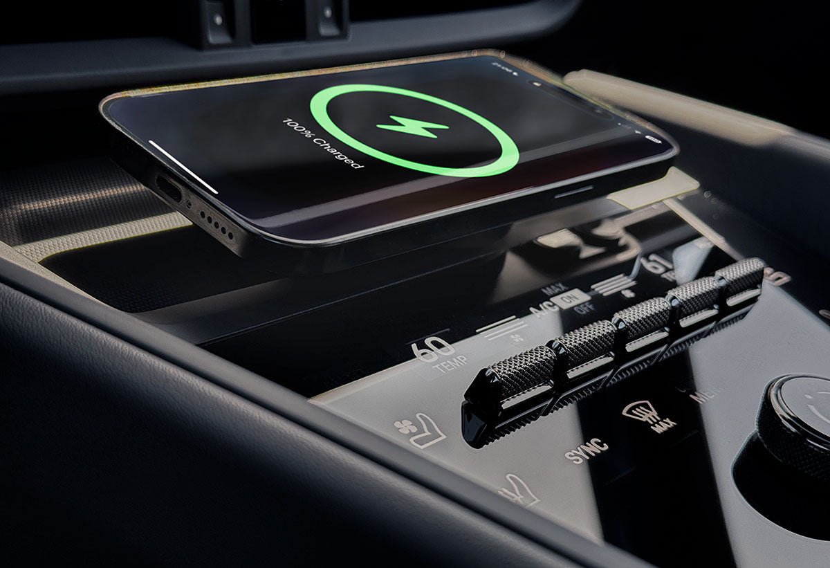 The beauty of the Apple® MagSafe® system is wireless charging so let's keep the interior of your Macan Electric just as beautiful. This carbon fiber composite MagSafe mount fits neatly in your front cubby with no visible wires and keeps your Apple® iPhone® 12 series and newer charged. This is a toolless install that literally takes a few seconds with absolutely no modifications to your beautiful Macan interior. Our mount includes a black MagSafe compatible charger.