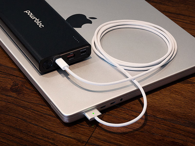Powrbloc Flight works with either the included 100W Power Delivery USB-C cable or your own MagSafe cable that comes with the new Apple Silicone MacBook Pro.